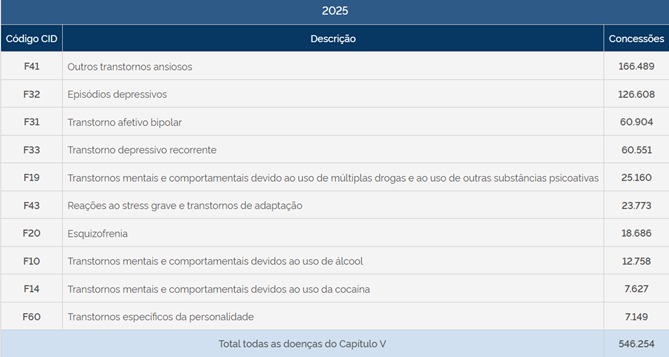 Entre os códigos com maior número de concessões estão transtornos ansiosos, episódios depressivos, transtorno afetivo bipolar e transtorno depressivo recorrente. Também aparecem, com números expressivos, transtornos relacionados ao uso de álcool e outras substâncias psicoativas, esquizofrenia e transtornos de personalidade.